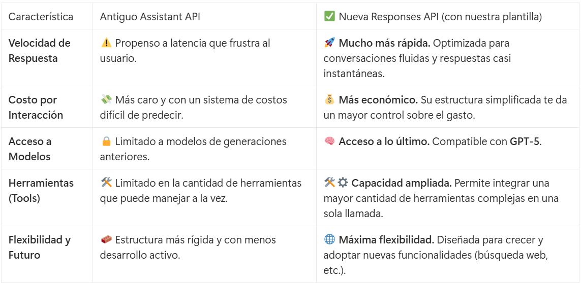 La nueva Responses API es el futuro, y nuestra plantilla está construida para exprimir todo su potencial. No es solo una actualización, es una reingeniería completa que soluciona las frustraciones del modelo anterior.